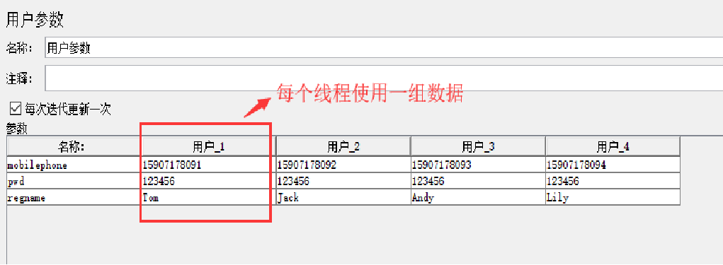 用户参数:可以在用户参数元件中定义参数及对应的值,一个参数可以对应多个值,比如下面一个参数对应了4个值(用户),这时如果在线程组中设置4个线程,那么每个线程将会分别取一个值。 - 后置处理器:后置处理器会在它作用域范围内的每个取样器执行之后执行,常用的后置处理器元件有正则表达式提取器、