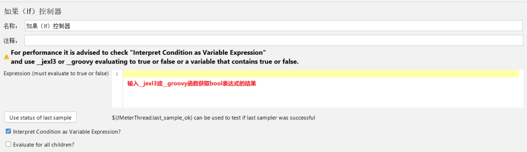 if控制器:如果条件满足,就执行if控制器下面的元件,要注意的一点是if控制器的条件需要以__jexl3或者__groovy函数来表示,否则无法识别。例如:${__groovy("${is_delete}"=="0",)}