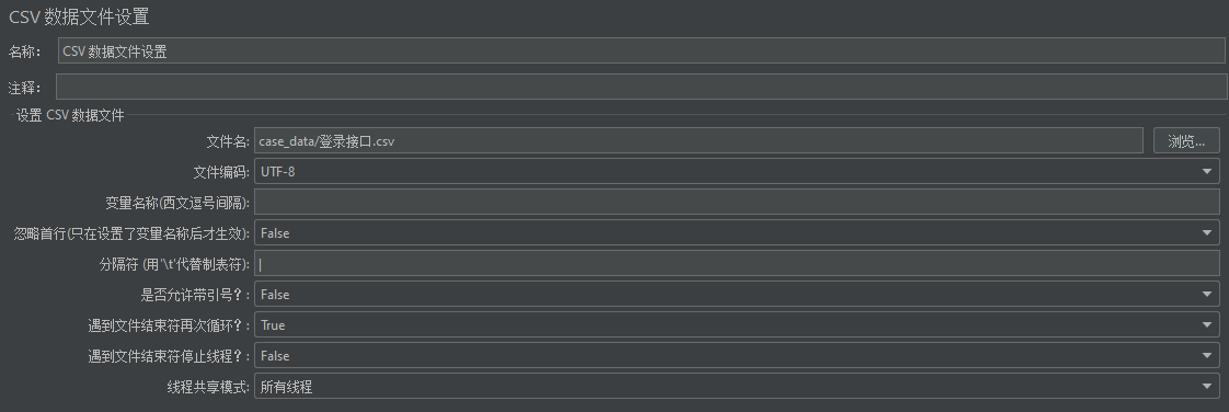 一般情况下只需要设置文件路径和分隔符就可以进行数据驱动,但如果配置变量名称时需要再将忽略首行设置为true才能正常运行。在取样器中以${n}变量的形式进行设置,变量默认为,建议改为|,设置好后就一列为变量的数据进行数据驱动,可设置用例标题、期望数据、用例数据、鉴权依赖等。