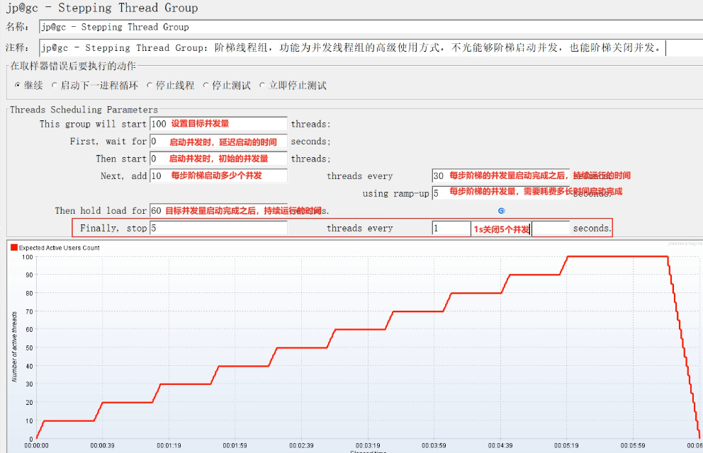jp@gc-Stepping Thread Group:阶梯线程组,功能为并发线程组的高级使用方式,不光能够阶梯启动并发,也能够阶梯关闭并发。