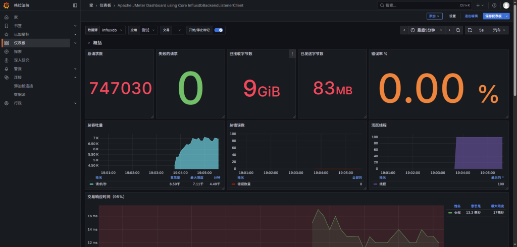 解决了资源指标的监控,还需要解决业务指标的监控,这里就会用到另一个数据源InfluxDB。在Jmeter中可以通过后端监听器选择InfluxDB将数据采集到后存放到InfluxDB,最后在grafana进行展示。InfluxDB是通过golang开发的时间序列数据库。