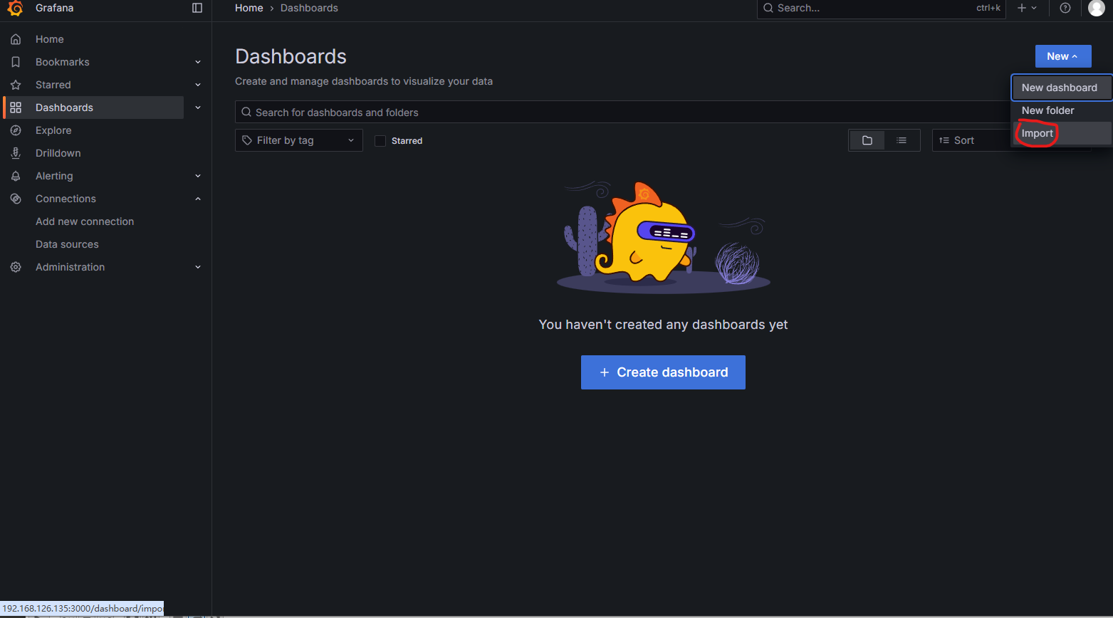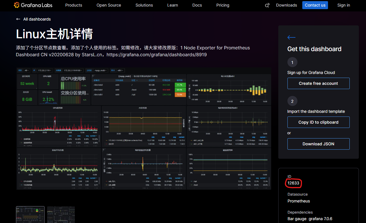 创建监控面板,通过导入官方面板来创建。通过官方模板的ID来导入面板。https://grafana.com/grafana/dashboards/